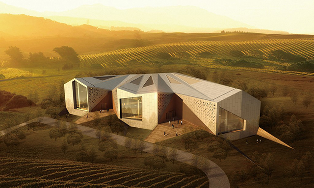 The Goldstone Winery in Dalian City of the northwestern portion of China, is an angular new build by the architects at OSO Studio Limited. This new take on a 'wine house' is a cool juxtaposition to the rolling hills of grapes and shrubbery. The architects said that they "developed a set of diagrams to define the building within the intersection of natural context and architectural typological." First, the team proposed a semi buried volume to meet the physiognomy of the site; building’s two boundaries and contour lines coincide, another two boundaries’ angle are adjust carefully to make the building seems meet the entire site program arrangement “accidentally”, respect the nature context and declare its existence.