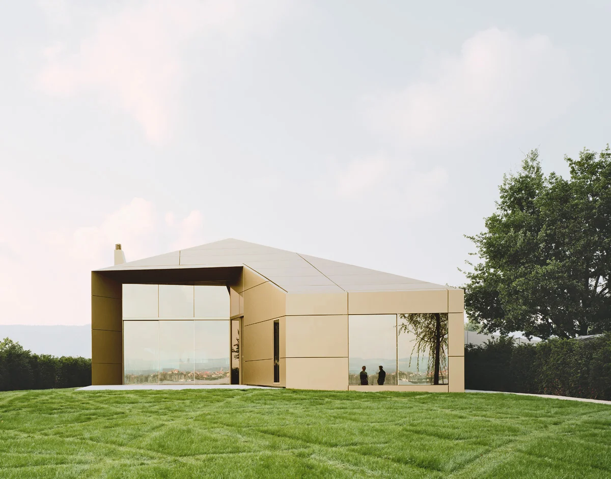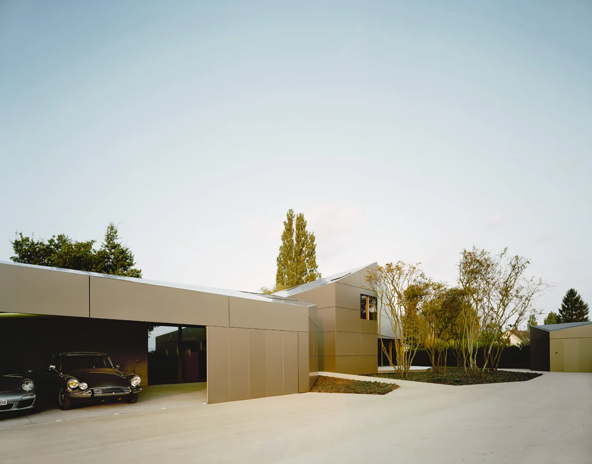 Biehler Weith Associates bring to the shores of Germany’s Lake Constance the Villa Moos. The Villa rises in three polygonal structures, smooth, sharp, and configured through infolding walls and surfaces. These irregular shapes and surfaces are cut through with a series of lines, tracing along mirrored glass panes and concrete façade alike. The lines combine to create a kind of grid, through which the structures are given dimension, and the smooth surfaces are incised with visual cues. The architecture delights in its simultaneous dispassionate appearance and tapestry-like effect. Gently-sloping roof gradients and a pale exterior hue blend in with the surrounding alpine geography, while the structure’s glass panes reflect a passionate vision of the lake and its shoreline flora.
