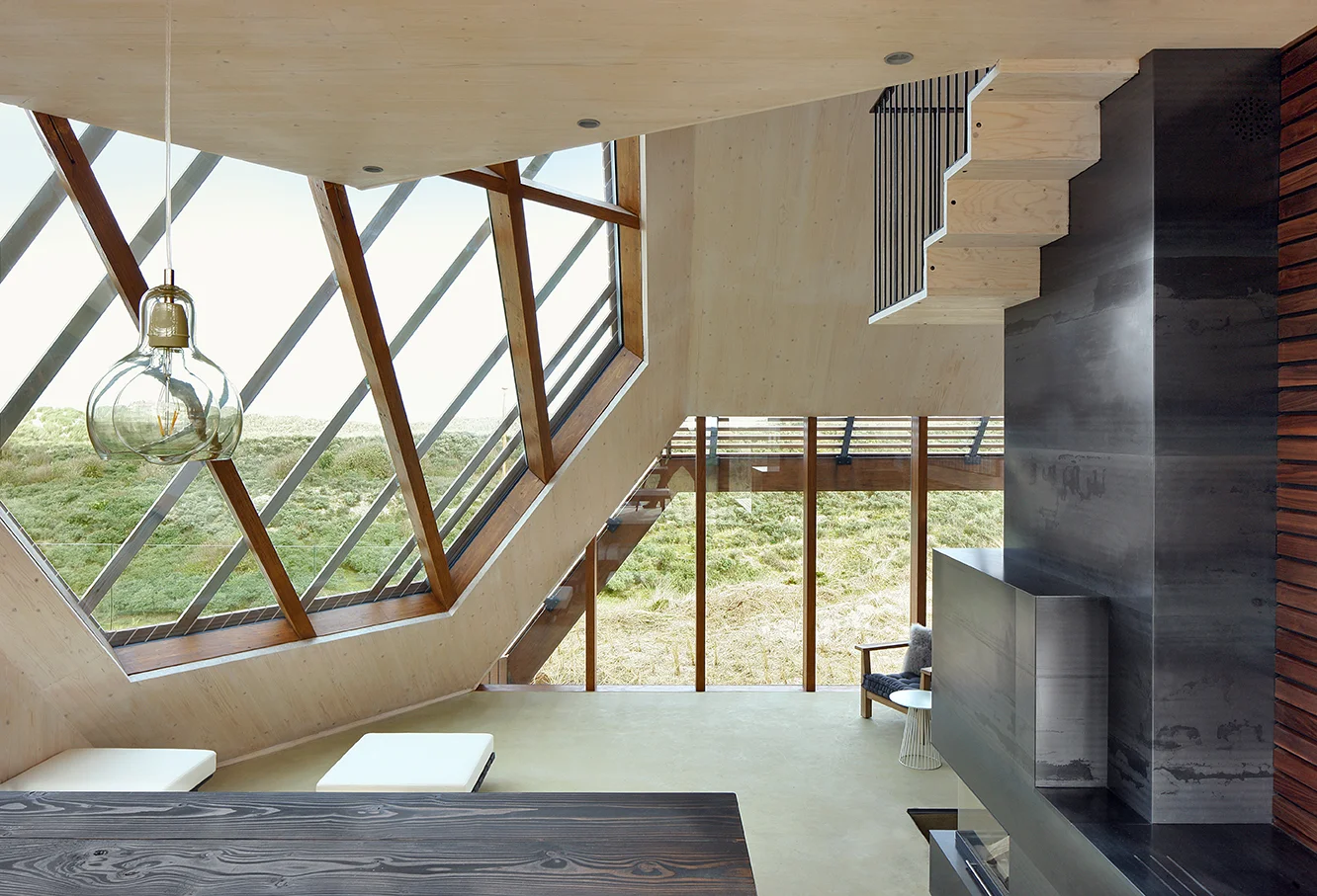 The exterior accords with the traditional design requirements set by the local government, but Koehler utilizes the wooden façade and a distinctive pitched roof design to strike a dramatic profile amongst the dunes. Sandy in hue with natural wood construction, the house blends. The angular shapes and the perfectly smooth slats of the façade speak of the modular, site-specific work of Marc Koehler Architects. More importantly for Koehler, though, is that his design philosophy is driven by sustainability, utilizing innovative modular building techniques with eco-friendly materials, a wooden roof with angled sun blocks, and a biofuel central heating system.