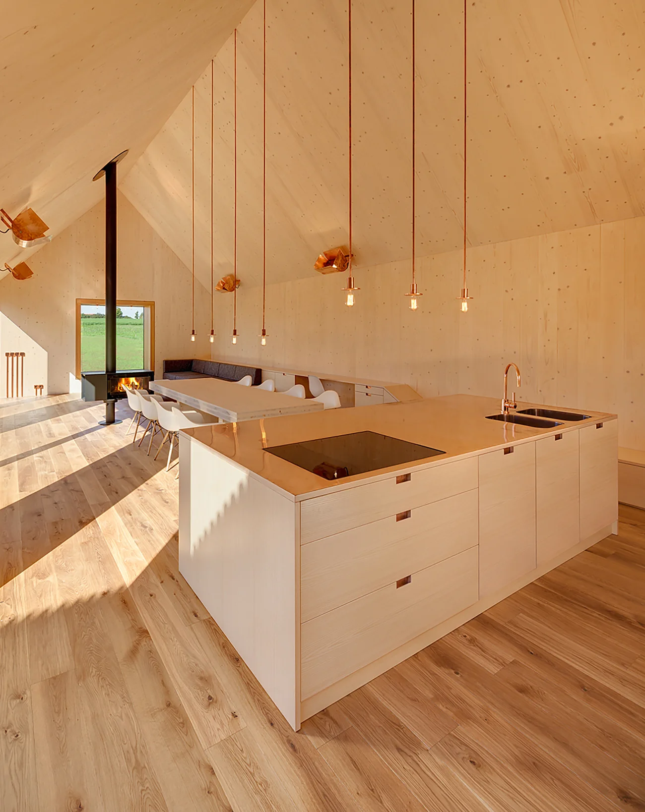 Going inside, the space is just as bright as the rest of the house and captures the open feel of the pastoral landscape. Giant windows bring in light to bestow the muted, natural colors of the house with the verdant green and sky blue palette of the outdoors. Most of the furniture is made from the very same wood that the house consists of, creating a wholesome, consistent feel that articulates a sense of comfort and congruence.