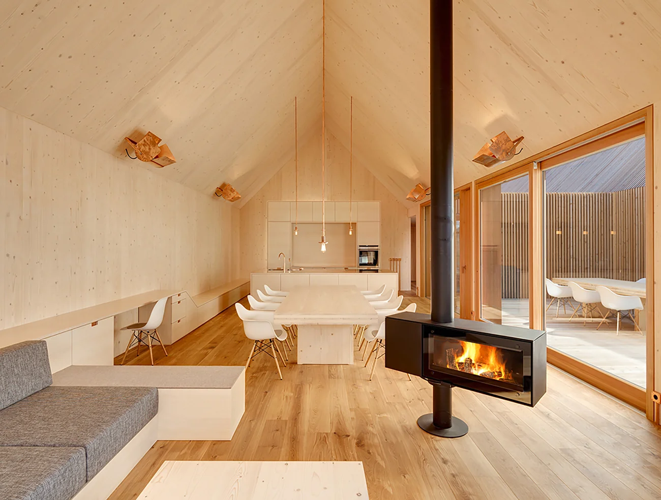 The fireplace, furniture, and even electrical switches and sockets were designed by Kuhnlein Architektur to perfectly fit the nature of Timber House. Keeping in touch with the warm colors of the house, the switches and lighting fixtures are milled from copper to establish the ultimate sense of coziness.