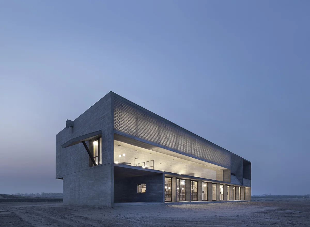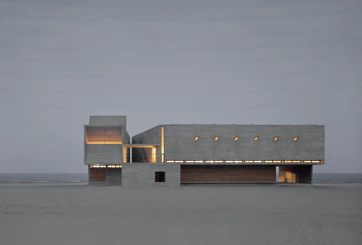 /Amidst dunegrass, dull green fading gray, a sturdy complex of concrete faces the sea. Approach from the beach or from ship’s view and the concrete softens at night with a glowing expanse of glass. The texture and tone of the concrete might fool the eye into thinking it a castle of sand, a gray model against the sea. Rather, China’s Vector Architects sought to craft a stage - “like a weathered rock” - whose every part is carefully designed to allow the best experience of light and shadow.