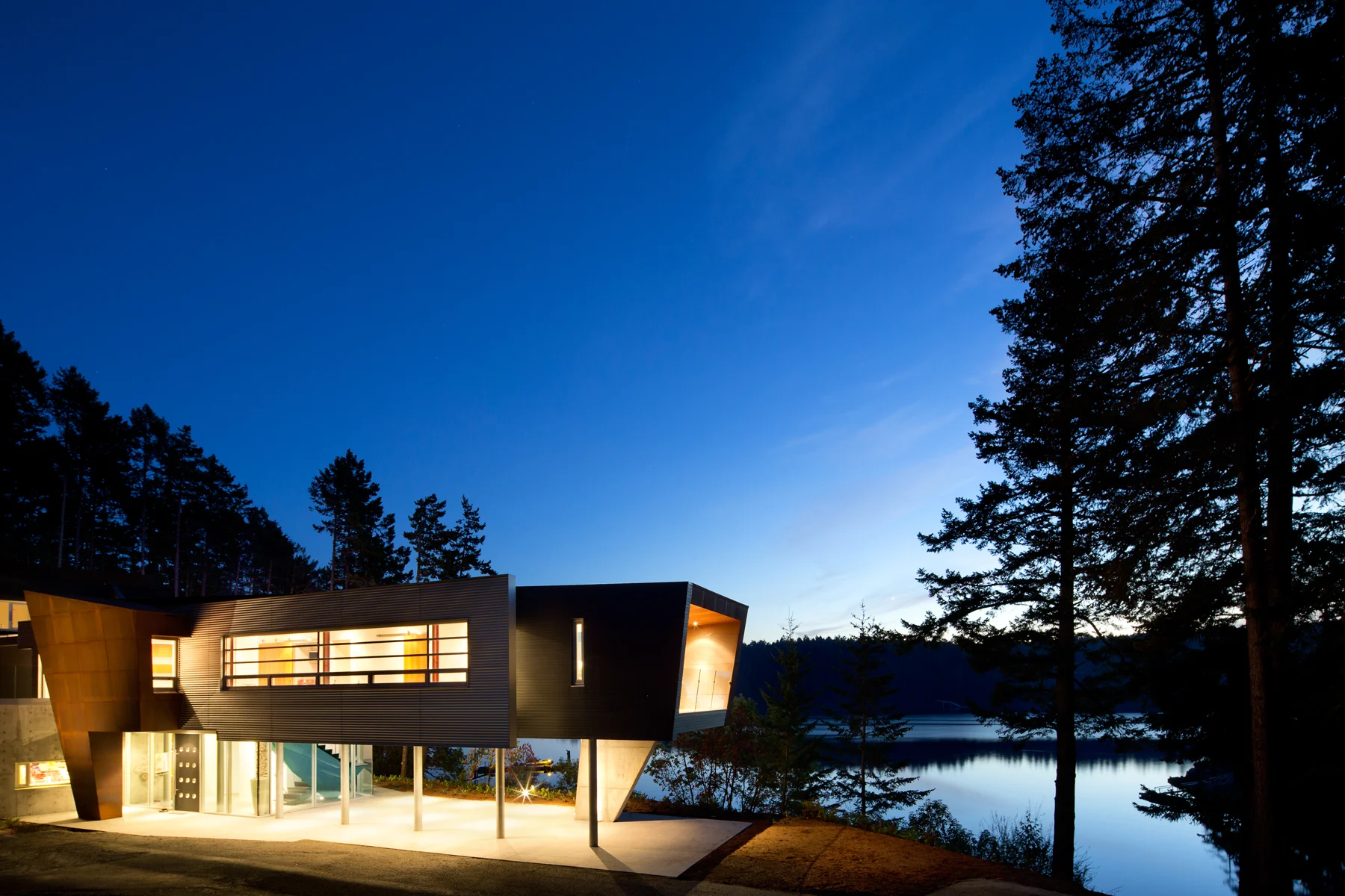 /The precarious, balancing beauty of AA Robins Architect’s Gulf Islands house is perhaps matched only by the painstaking task of erecting the architectural wonder. Situated on a rocky island off the coast of Vancouver, British Columbia, the 6,500 sq. foot, single-family abode is reachable only by ferry. As such, the structural modules for the house were prefabricated, shipped over via barge, and transported to the site by twenty-three trucks. (Admittedly, we’re sweating just thinking about it).