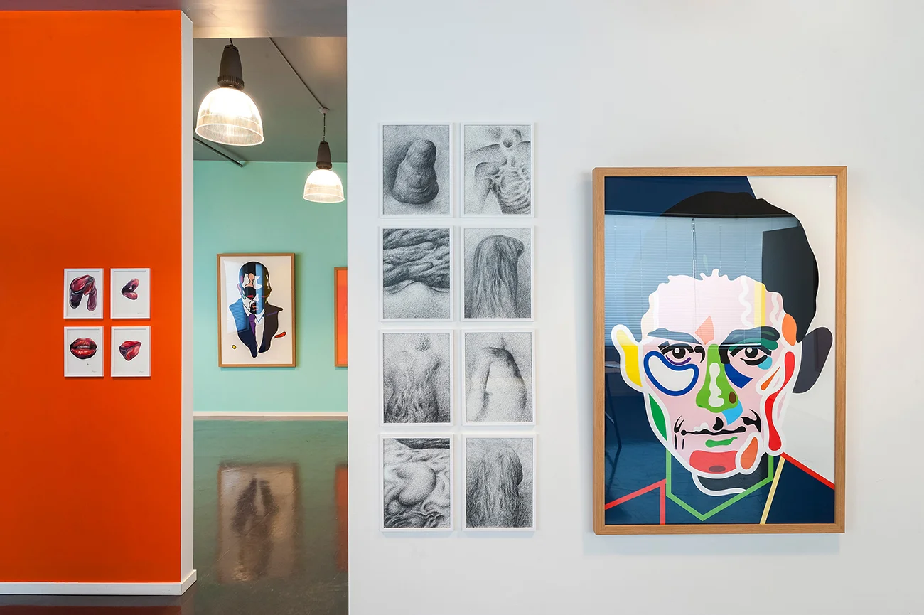 Magnus’ recent style reflects his impulse for exploration and “rapid evolution,” turning to such forms as ink drawing (the same bold lines remain and themselves create vitality without color), artistic studies such as The Walking Rodin, and sculpture. While the familiar essence of his portraits of hip-hop artists and celebrities, and the abstract forms and imagery of nature endures, the newest evolution is a bold distillate of sharp highlights and thick lines across concentrated hues. Take The Walking Rodin, for instance, whose cognitive illusion draws us to infer a face (or faces) along the torso . . . or waist, or elsewhere amongst the richly-outlined colors and shapes which compose the figure. Visual complexity is added, outlines pop, and perspective is given using lighter tones for shadow. Mathiassen’s recent work reveals nuance - an artistic evolution - while providing a more immediate connection for the viewer with a perception of the world that illustrates the “sheer ugliness and joy that exists side by side.”