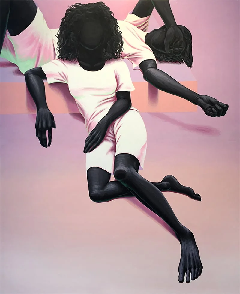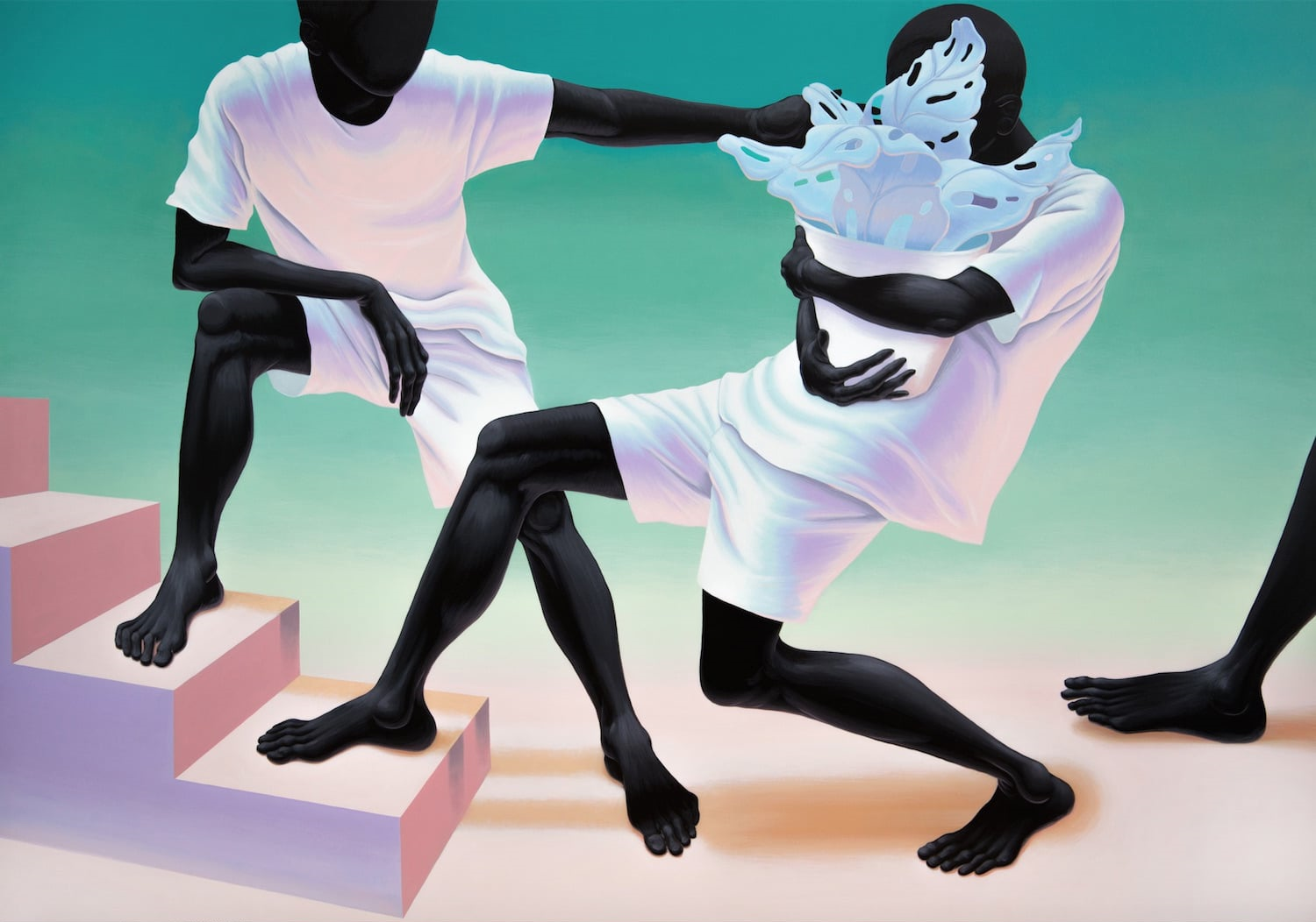 “Alex creates sculptural yet expressive figurative work set in a minimal geometric landscape. He draws on influence from Renaissance painters in the way to pose and gesture the figures to purposefully guide the eye through the composition. He relies solely on the figure and it’s interaction with simple shapes, and sometimes plants, to create ambiguous narratives. The aim of his work is to convey the mood and emotion of a specific life event without explicitly describing the event itself. The anonymous figures allow viewers to project themselves into the narrative while also depicting issues of identity. Gardner explores human nature and reoccurring themes such as desire, ethics and anxiety, which are often juxtaposed with the notion of leisure. Gardner’s African and Japanese heritage has an influence in his work. Having travelled extensively to both regions, he uses these personal experiences as inspiration and aims to create relatable visual narratives through stark figurative compositions.”