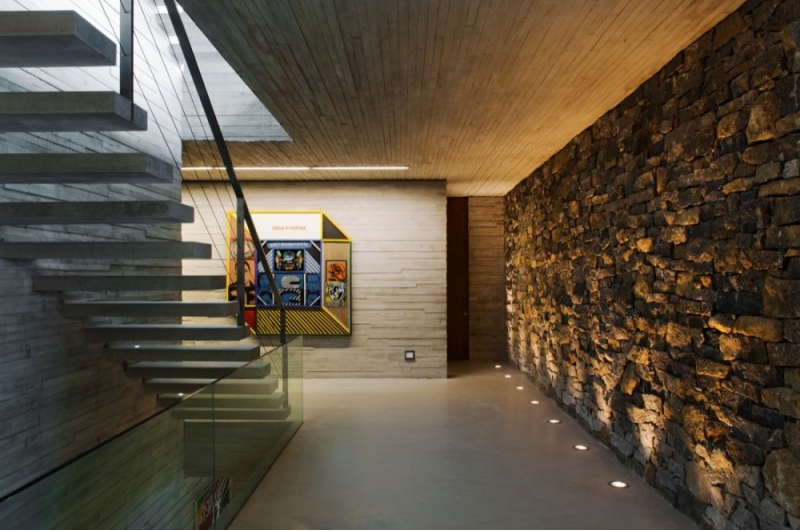 The same entrance stairs also lead to the upper volume that houses the bedrooms. In the front part of the house, retractile panels of eucalyptus sticks protect the bedrooms from the sun. The areas that face the mountain have small internal patios with zenithal lighting, and use exposed reinforced concrete, which grants a striking texture to the walls.