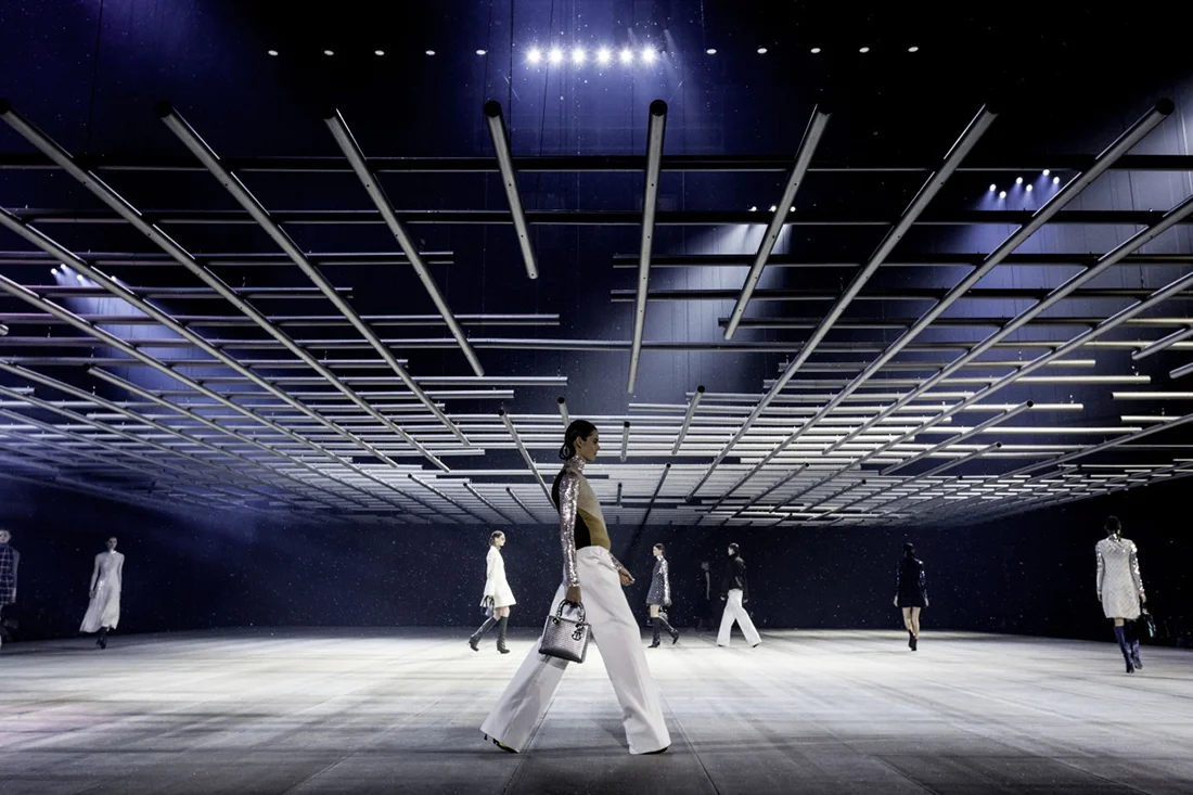 Raf Simons is particularly drawn to Japanese expression and style, and his celestial runway represents a futuristic mesh of East and West, where fantasy meets reality, and where conventions are challenged and transgressed. Viewers are met with an abstract urban landscape, part space station, part animé. Metallic blacks and neon lights create a deep-space surround, while the enormous cubic stage floats underneath a complex titanium grid. The landscape is space, softened by starlight and gently falling snow, while the soundscape takes tunes from Blade Runner and Interstellar, further edifying the show's abstraction into science fiction.