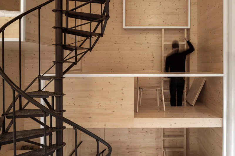 The standout structure of the studio is the wooden installation made of pinewood panels that spans from floor to ceiling. Each portion of the installation is playfully divided by a series of boxes and levels that may be accessed via multiple flat wooden ladders. One level contains a desk, another hides a pantry, and the highest level contains a daybed enclosed in a cantilevered cube. In total, the structure is a kind of living cabinet, each level providing a new perspective.