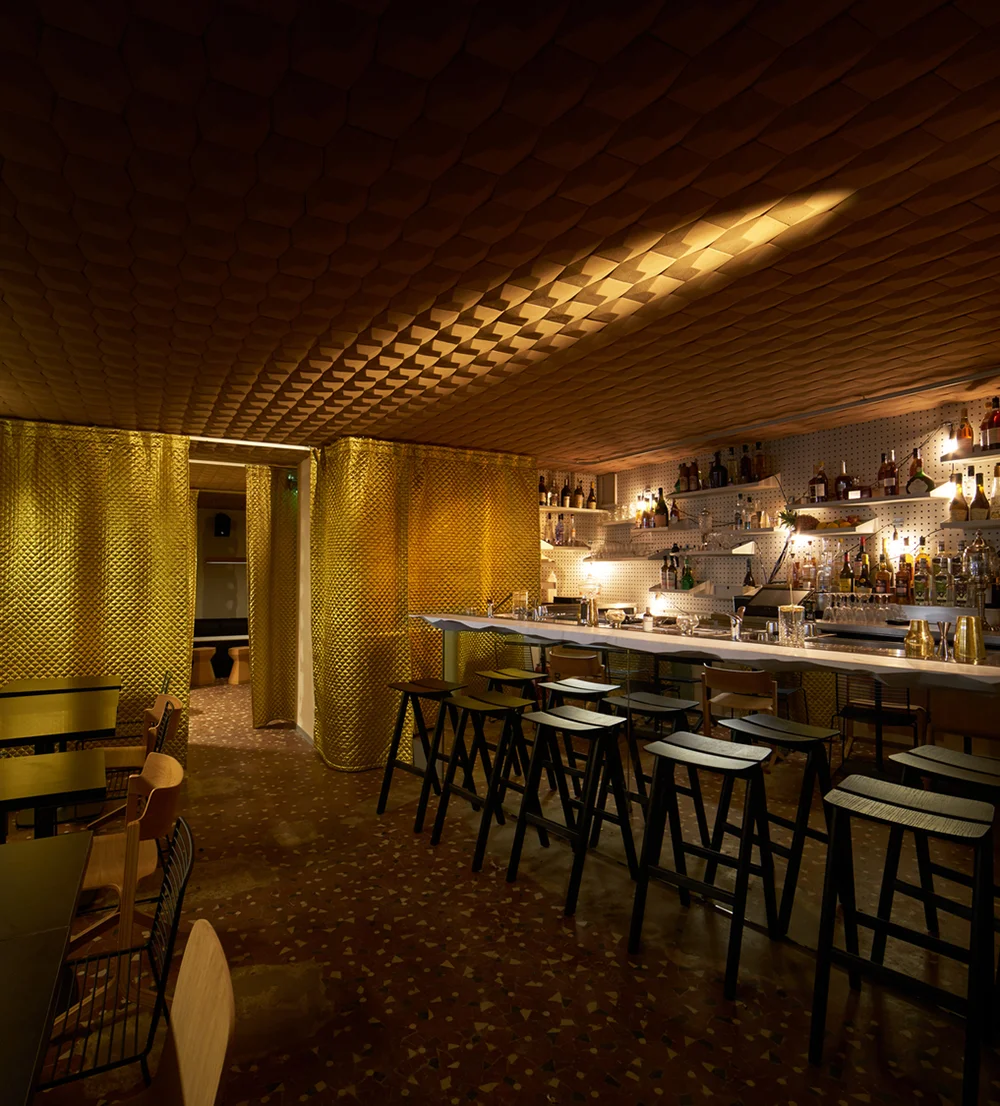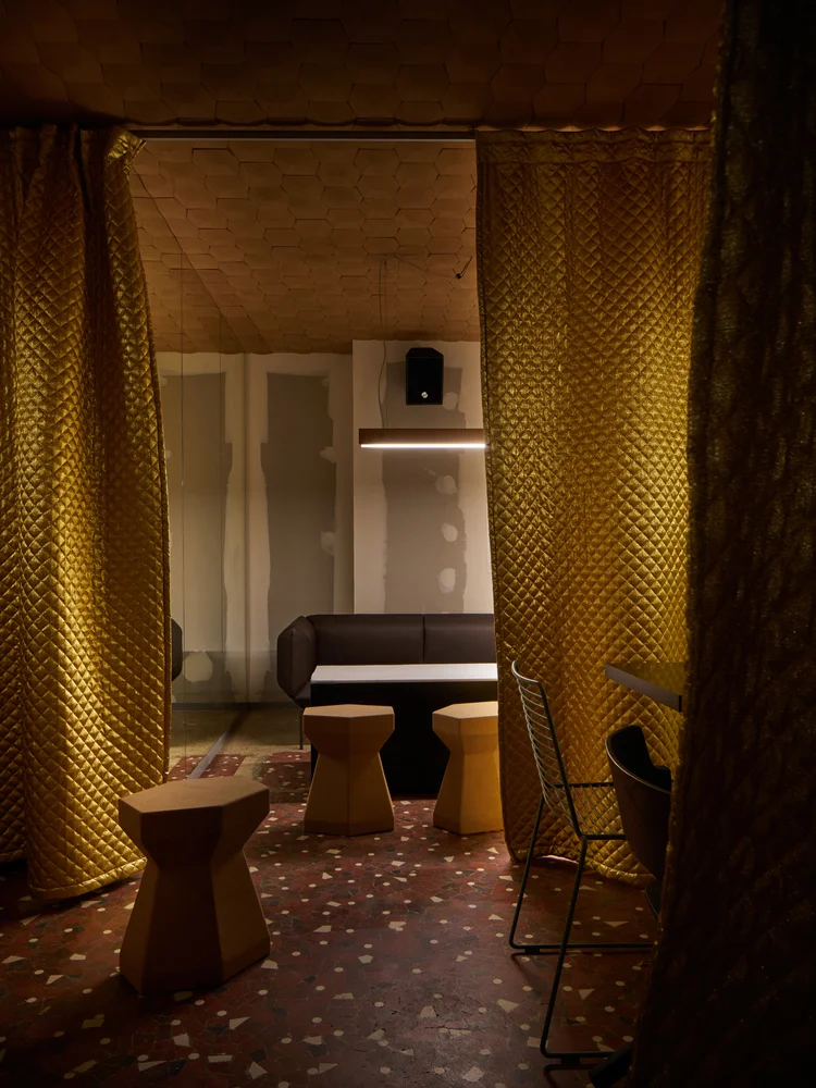 Inside you will find the original broken mosaic flooring that has been reworked, golden quilted curtains and cork tiles over the whole ceiling. The marble bar top is in similar CNC-cut patterns, and the back wall is covered with warehouse steelwork, shelving, and technical fixtures for bottles, glasses, shakers and the like. There the barman appears framed in spotlight performing his secret art of mixology, hidden in this urban hub.