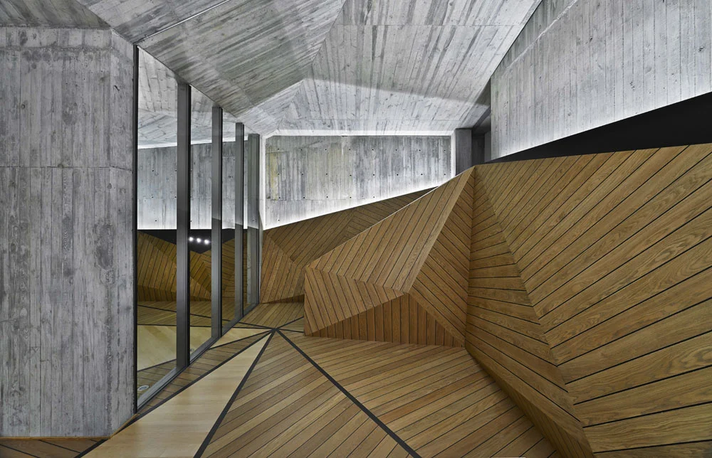 The Clubhouse as a whole is a reflection of the building’s outer shell and the natural landscape that it sits upon. The distinctly slanted and skewed wood paneling on the ceiling and walls is meant to be representative of the hilltop’s uneven terrain. Through the execution of this inventive design, the interior is a reflection of the uniquely geometric exterior.
