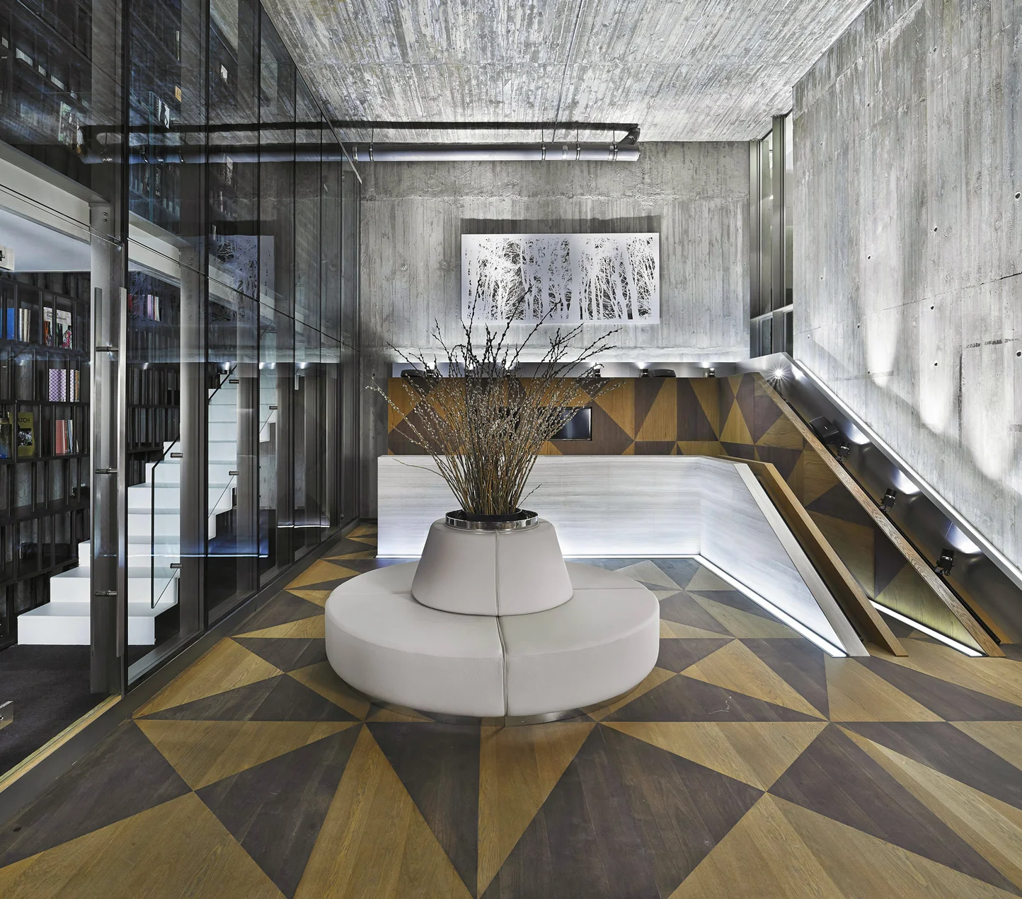 Within, there is a lounge area, a café, a multimedia room, a swimming pool, a spa room, and a fitness and cardio area. But perhaps the most interesting of all of these amenities is the library. Designed as a transparent box with floor to ceiling glass panels, the library illuminates Autoban’s architectural approach of creating a space-within-a-space.