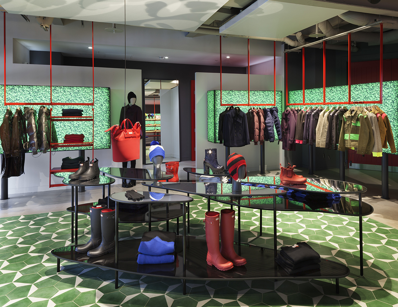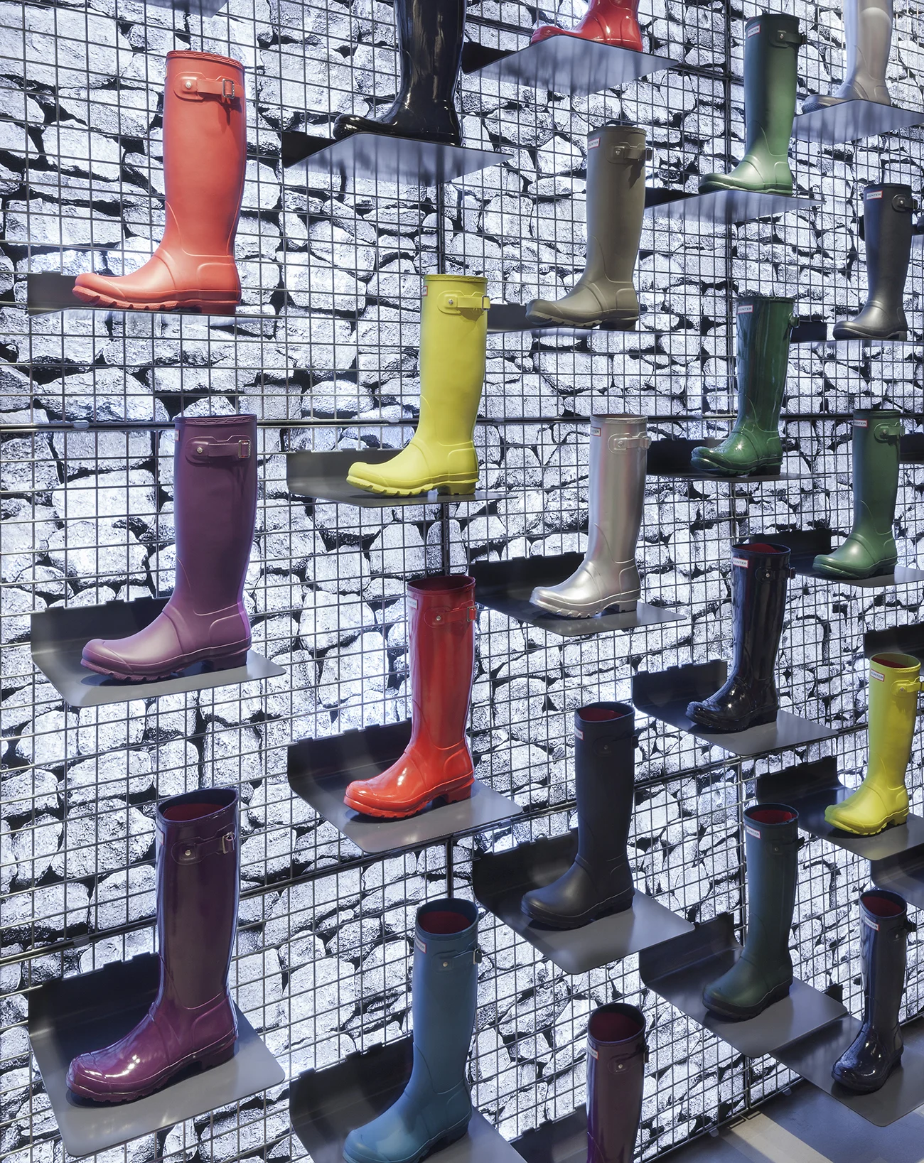 “Surreal, graphic, and at times dreamlike, it’s a fantasy take on reality executed in a uniquely Hunter way,” says Checkland Kindleysides creative director Joe Evans. When you enter the new store you’ll first notice that a structure reminiscent of a modernized barn connects the front entrance with the rest of the store, something hinted at through the metallic agricultural architecture apparent in the windows. Light filters in through Douglass Fir rafters to give a simulated sense of sunlight after an imaginary downpour, creating a sort of narrative journey throughout the store. Boots, hats and other products playfully lay on tables shaped like puddles or hang just above them as if drying. The back of the barn features a gabion dry stone wall where Hunter’s Original Wellington Boots are showcased.