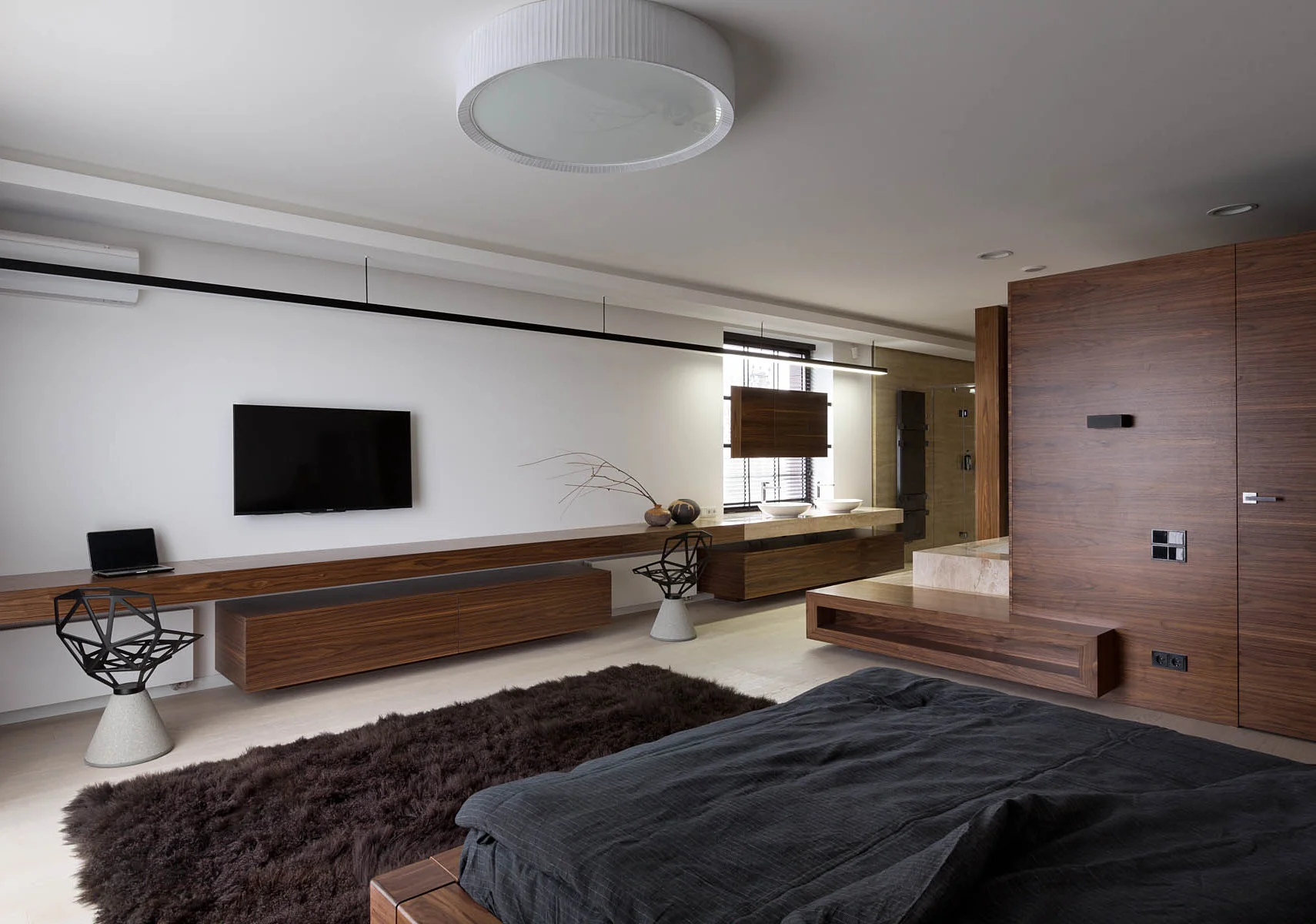 There is a motif running throughout of long, wooden panels with horizontal grain, giving the space a sense of vastness and continuity that adds to the intrigue of the new design. The designers were intentional about the mainly white and black color scheme, which helps the natural light to flood into the space, only blocked by small shades and translucent curtains that adorn the windows. Even the furnishings of the area are in these colors, as dark chairs and sofas are used.