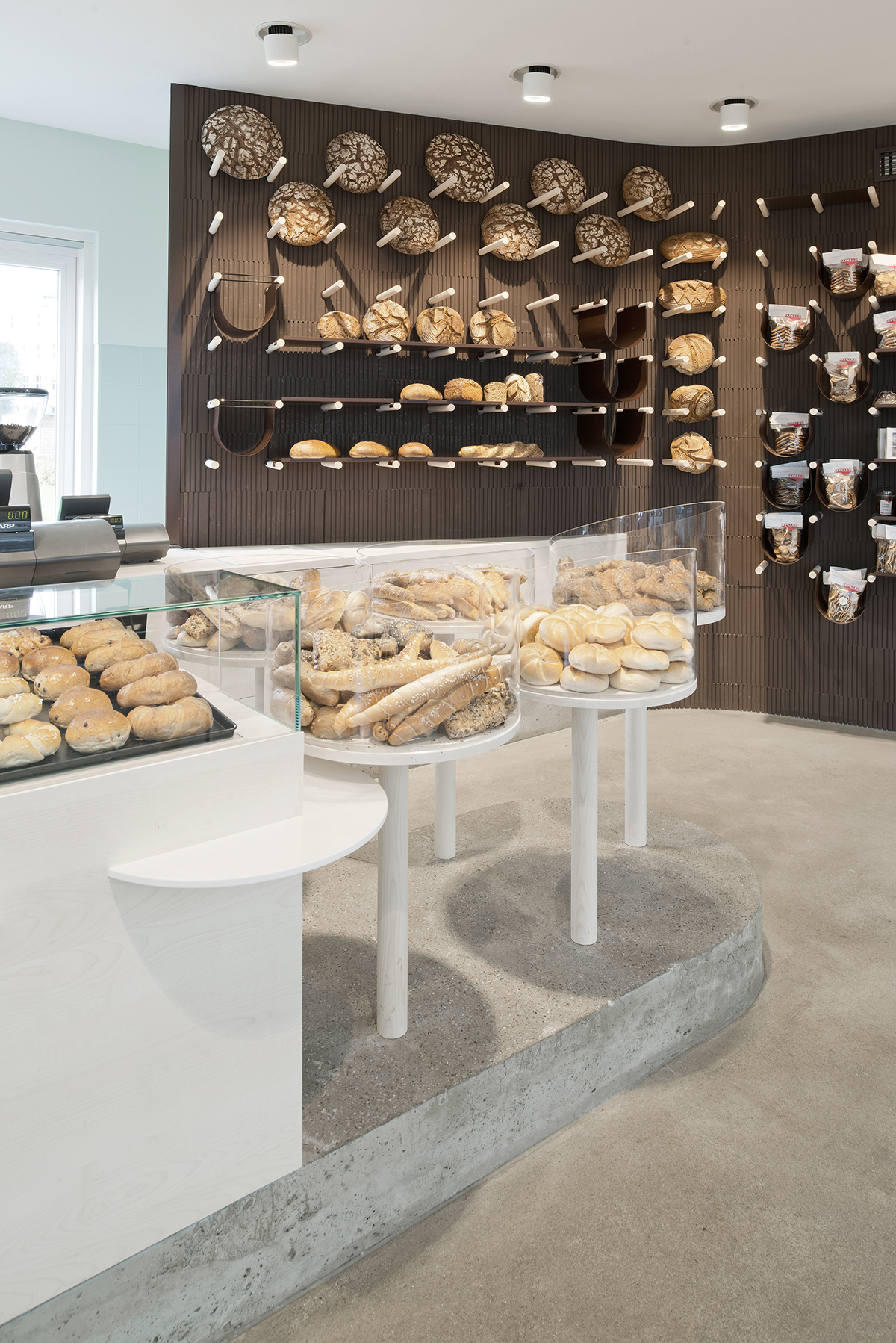 Upon entrance, the design is reminiscent of a modern, Scandinavian design; airy, light, and fresh. Easy on the eyes and minimal in furnishing, the area is efficient and sleek. Drawing from the natural setting, maple wood has been used for most of the bespoke display cases and seating areas, and for a more modern finish, concrete covers the floor. Created with flexibility and accessibility in mind, the converted space sports a free standing counter, which allows for customers to get up close and personal with their chocolate croissants. A distinctive brick wall, lined with wooden spokes make for an interesting method of displaying breads. On the opposite wall, also spoked, hangs seat backs, an unexpected and clever use of the design element.