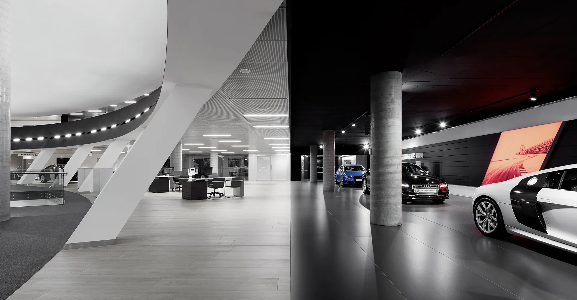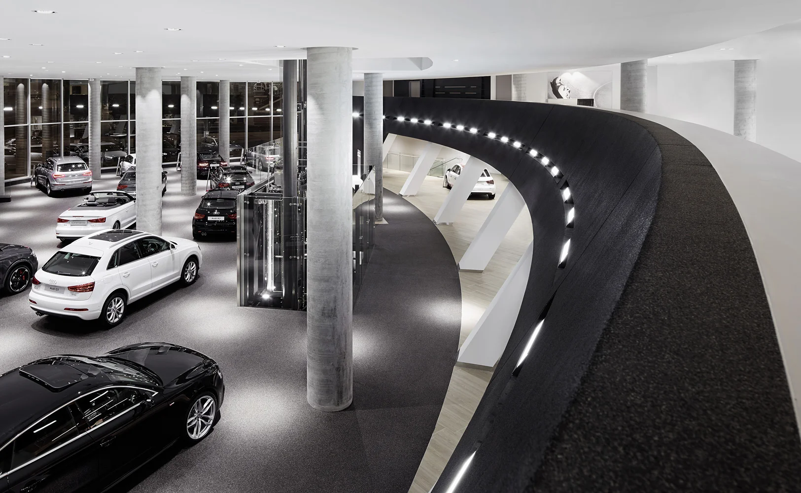 The main floor follows a motif present throughout the building. Tied together by clean-cut, smooth, reflective surfaces, the rooms shift between dark and stark white materials to showcase the duality between the different brands. In the center, a black road-like stripe (including lights that resemble lane markings) wraps around the walls, not so subtly reminding us of a high-speed racecourse as it gently swoops along the sides. Glass partisans divide sections, allowing a sense of openness to pour in from other rooms and perhaps more importantly to create a chance to view a brand new Audi or Maserati at every turn.