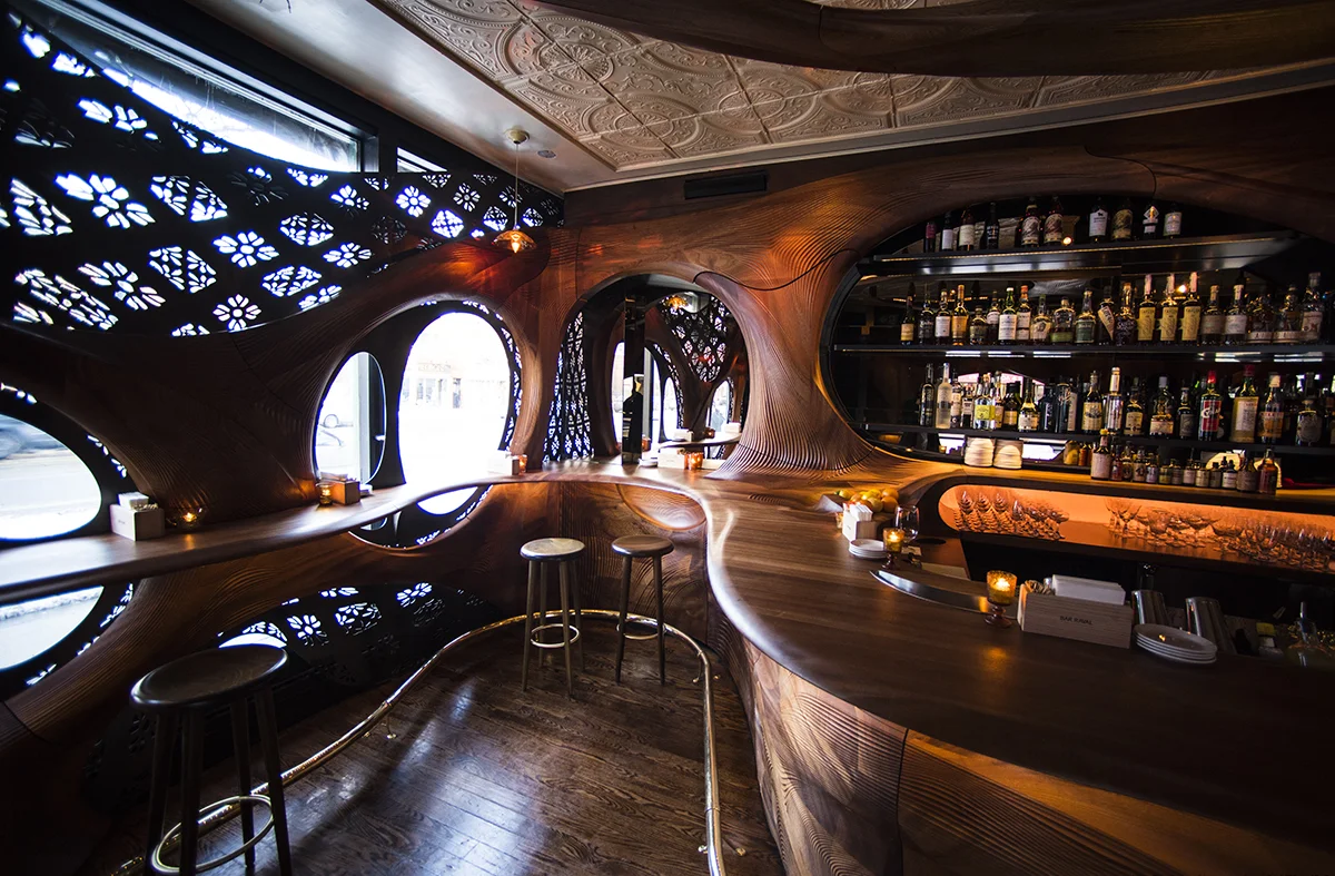 Heavily inspired by the art movement, the bar of course alludes to tropes and iconic stylized imagery of nature that’s a staple to the era. Of course, it isn’t quite so cut and dry, as PARSITANS’ design also takes after something different: the owners. Sculpturally, the mahogany patterns resemble muscle tissue and in some points even paying homage to the tattoos of the three owners.