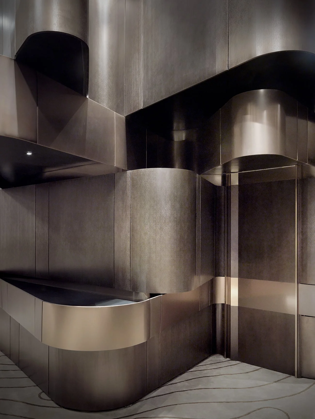 One Plus Directors Ajax Law Ling Kit and Virginia Lung sculpted wave-live forms throughout the space, employing warm tones and metallic walls to represent the idea of rough seas. The walls are broken into five significant parts, each part curves on its own path, creating a visually stimulating effect. The neutral-toned carpet mimics the wavy motion of the walls with its striped pattern that also resembles a map of the ocean floor.