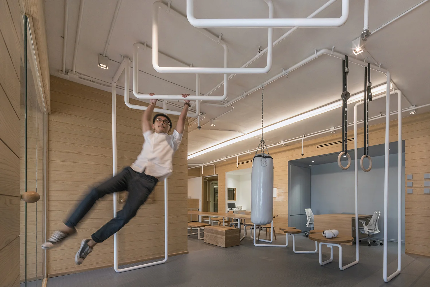 /The life of an IT guy. It can’t be all that thrilling. Or can it?? Thai Architect firm, Onion, says otherwise. Outfitted with monkey bars, punching bags, cozy, nap-ready nooks lined with cushy pillows (pillow fight, anyone?) and straight-up, Olympic-caliber gymnast hoops, the Bangkok-based office is a veritable jungle gym.