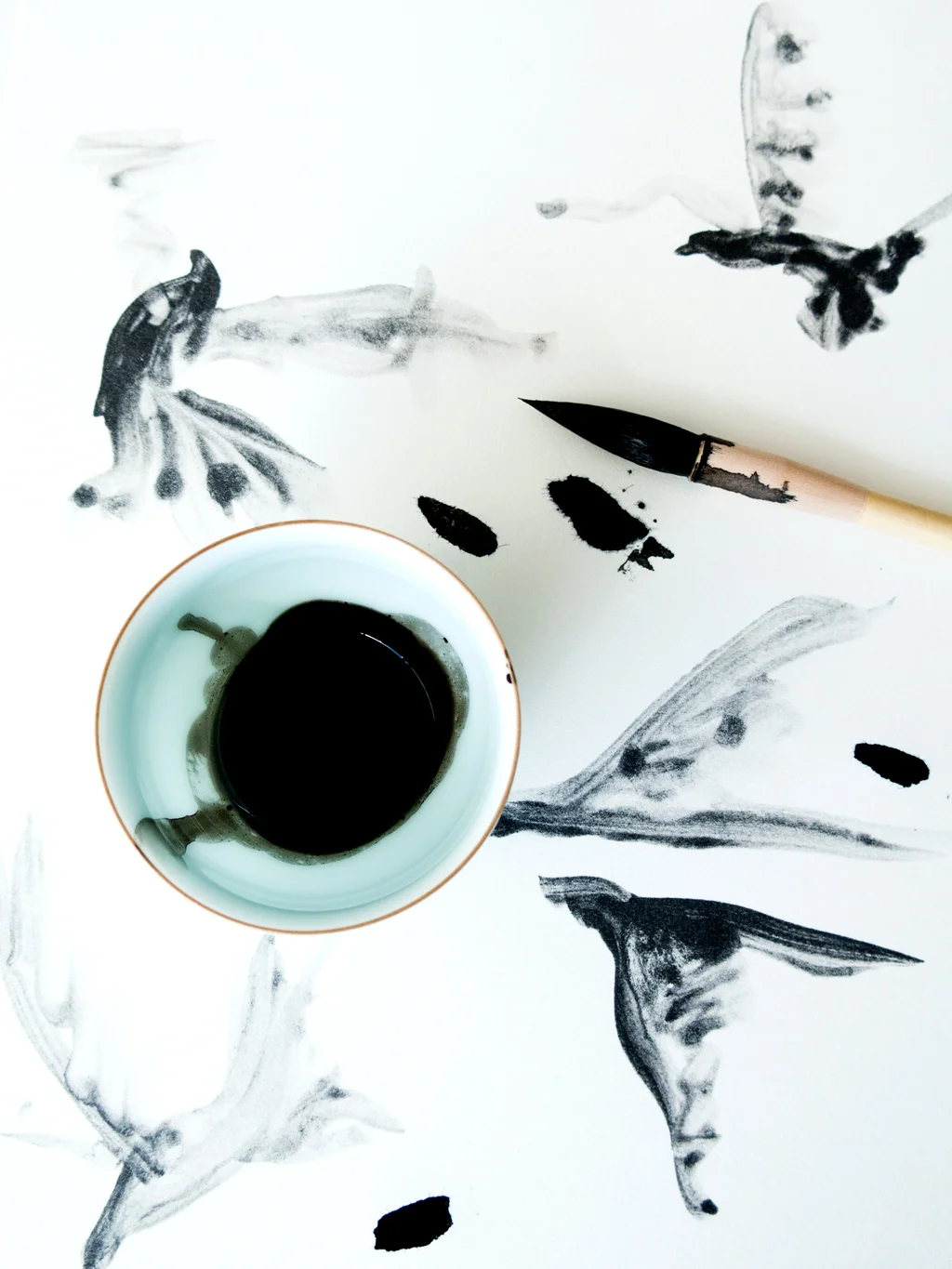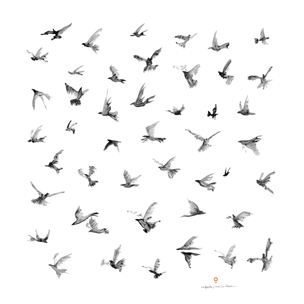 As the birds flew by Azúa’s studio window, he begun to paint. Loosely dabbled black blots and strokes unified to form each of the tiny birds in flight. The artist transferred his artwork to digital and then imposed the imagery onto lightweight Crepe silk scarfs, a lustrous material of unmatched versatility.