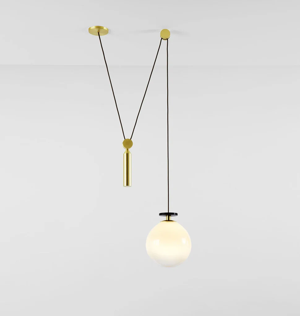 The versatile pendant lighting system consists of four primary shade shapes: Metal cone, glass sphere, cylinder, and arc. When combined with L&G's adjustable height option, the lamps can be adjusted in height at any time via the solid brass counterweight and pulley hardware.