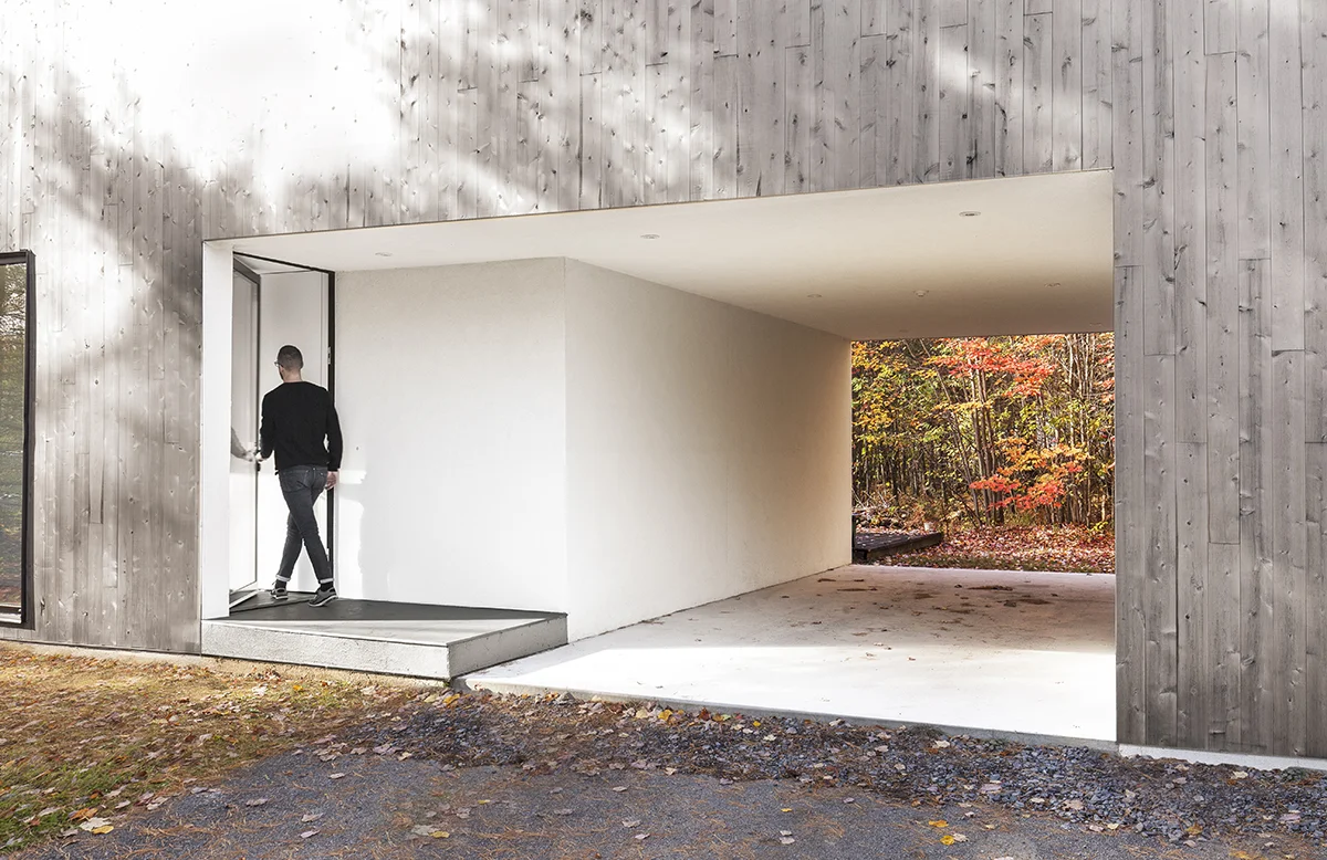 The exterior is covered in natural eastern cedar siding that will fade over time to eventually further bear a resemblance to the bark of trees in the surrounding woods. Simple openings surrounded by black frames serve to punctuate the sheer volume of the house. The former garage has been replaced with a covered parking space that’s open on either end, and thus gives the impression that it was emptied. This openness creates a sense of transparency that, like all large openings, provides the space for nature to reclaim its place.