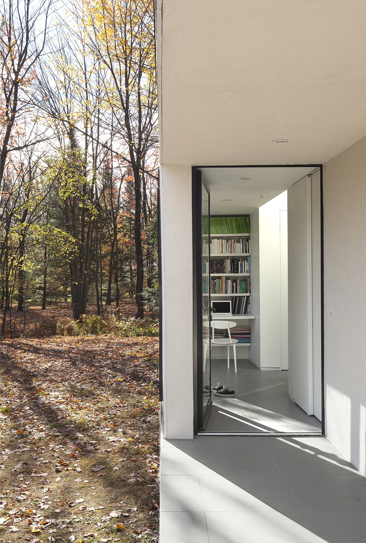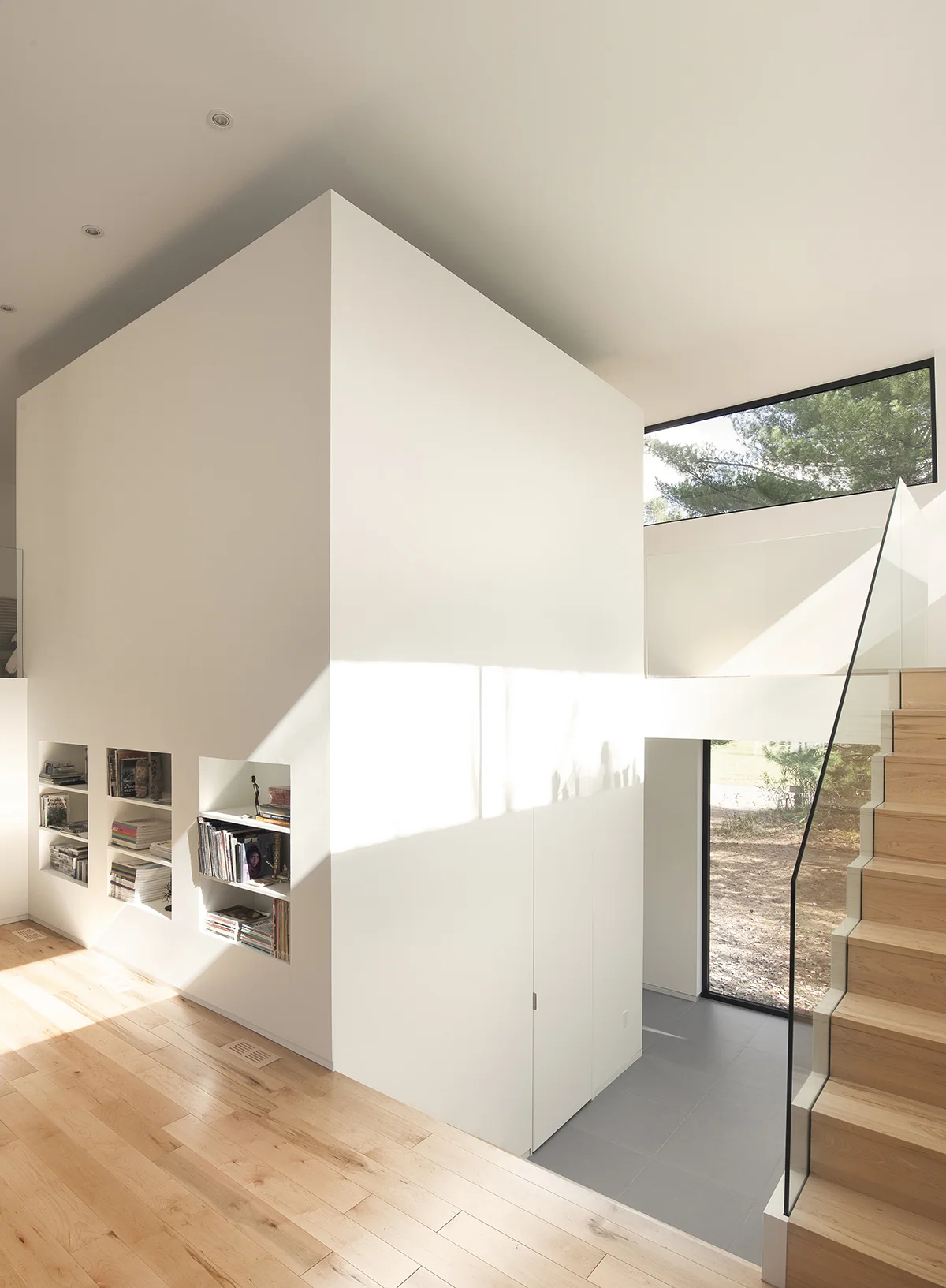 The house now features three split levels that are each designed for a distinct set of functions that help establish a clear hierarchy between intimate and communal zones. These zones are designed to be very open in relation to each other and are only divided by the threshold created by the flights of stairs. Directly accessible from the carport and at the same height as the ground outside is the first of three levels that contains both the entrance vestibule as well as a small office. Even though this entry zone is also open, it is concealed from the living spaces on the level above. Once in the center of the staircase leading to the second level, the visitor comes face to face with a large window with a view on the woods behind the home. The kitchen can be found there, organized around a large wooden island whose materials stand out in relation to the neutral white walls. Along the large bay window adjoining the kitchen can be found the dining and living rooms. At the crossroads of all these levels is located a pure white block that naturally reinforces the intimacy between zones and around which gravitates circulation within the home. This block has a powerful effect on the upper portion of each level as a result of it being unattached to the ceiling, which allows for both an unobstructed line of sight and opulent natural lighting.