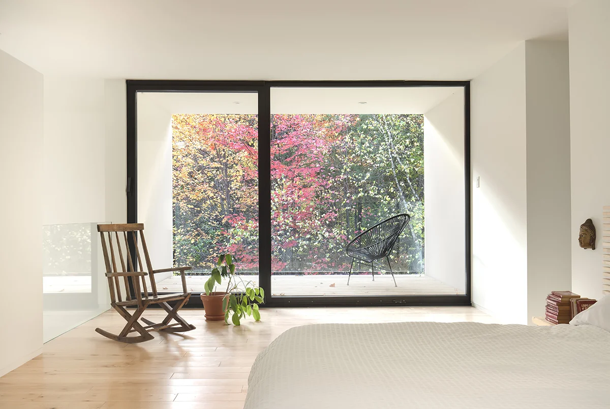 The bedroom is located at the very back and opens partially to the living spaces below. In order to limit visibility from the outside into this room, windows were voluntarily limited in height and therefore create long strips of light. At the rear, the room extends towards the woods by way of a loggia. From here the surrounding natural environment can be viewed without any obstacles thanks to the transparency of the glass railing barrier.