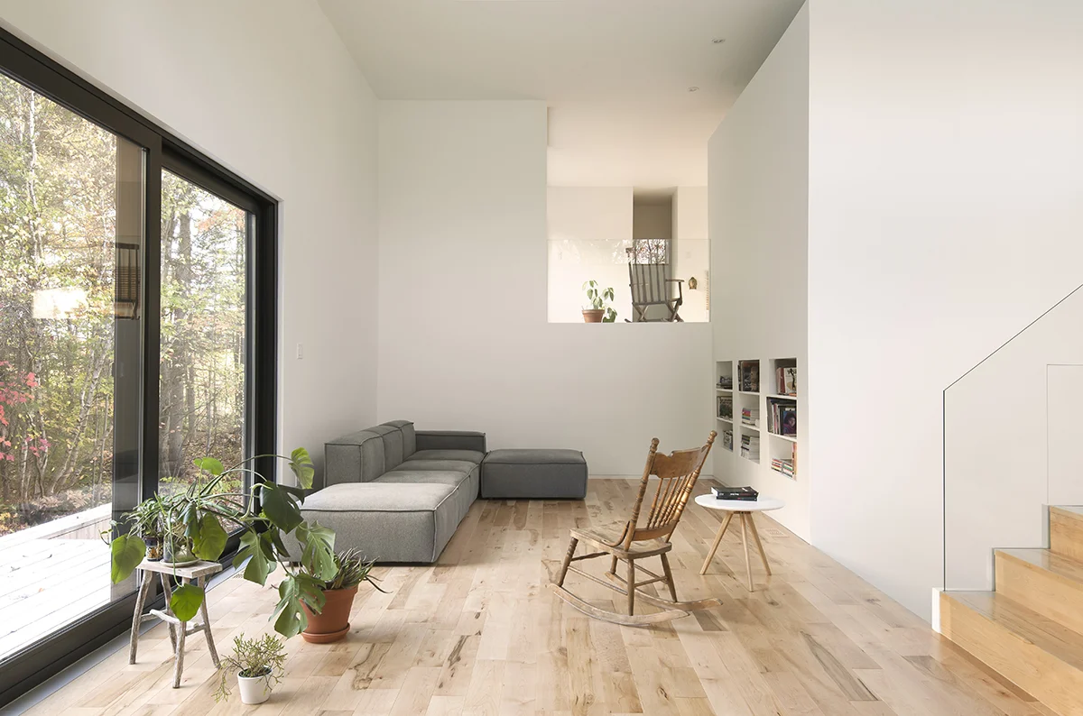 /Born from an extreme transformation of a typical 90’s bungalow, the “Maison Terrebonne” is located on a vast wooded plot of land. Although certainly contemporary, the new residence, designed by La Shed Architecture, is built on the same foundation as the original house while preserving one of its principal characteristics; split levels. This principle is at the very heart of this building’s new architecture. This thorough building overhaul, in combination with a larger upstairs, was designed in order to meet the needs of a person living alone. Despite a small 1500 square foot living space, the residence offers vast open rooms with an abundance of natural lighting.