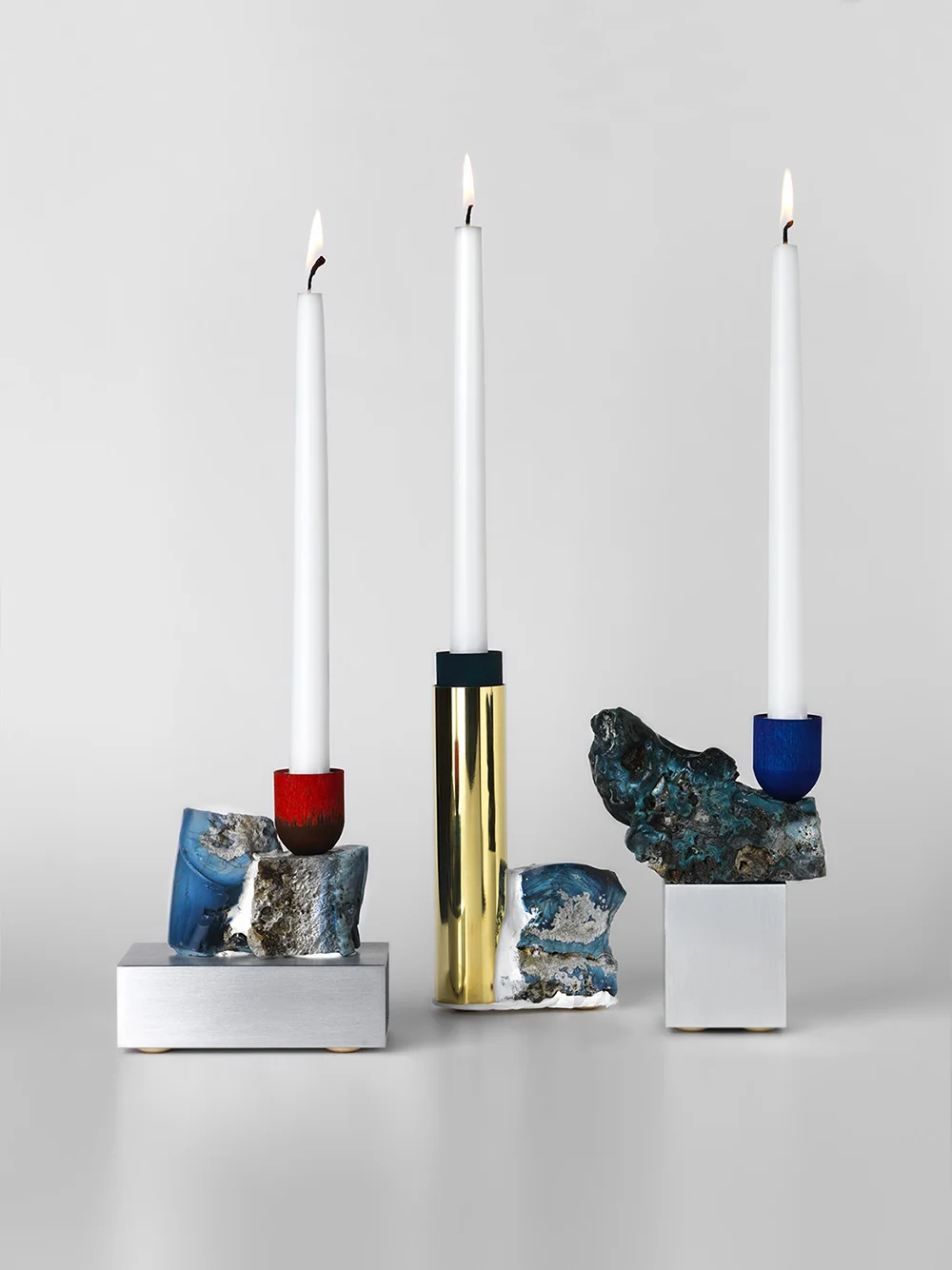 Taylor’s most recent collection ‘Slag’, combines brushed aluminum and polished brass with waste material found on the site of a former iron foundry to create a series of candle holders. The slag – a bi-product of the smelting or refining of metal ore – is left in its raw blue-black state and attached to metal components using soldering, bolts and glue to create the candlesticks.