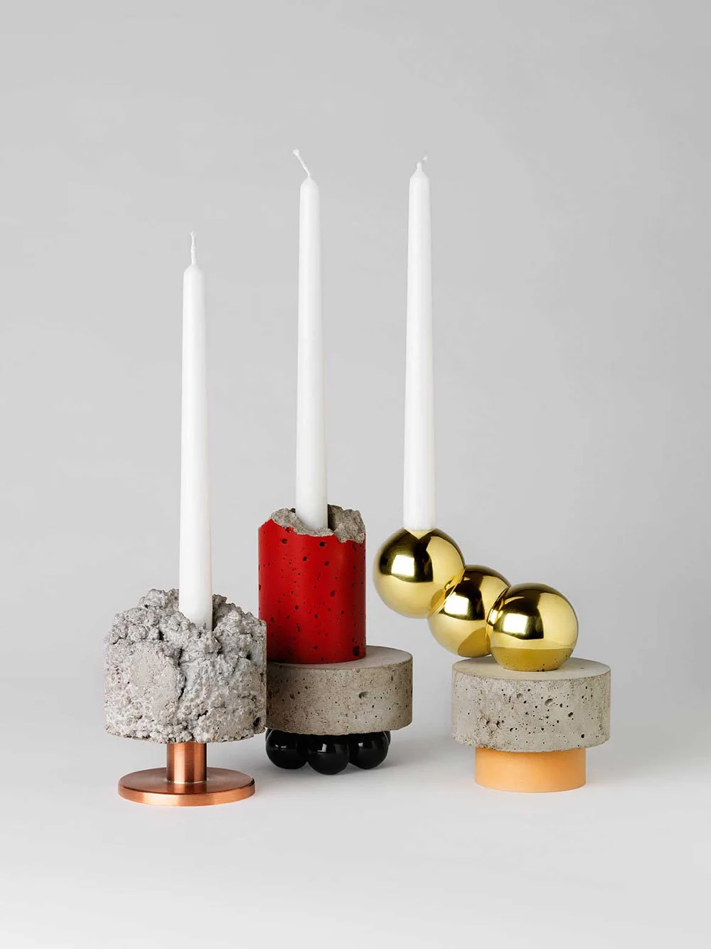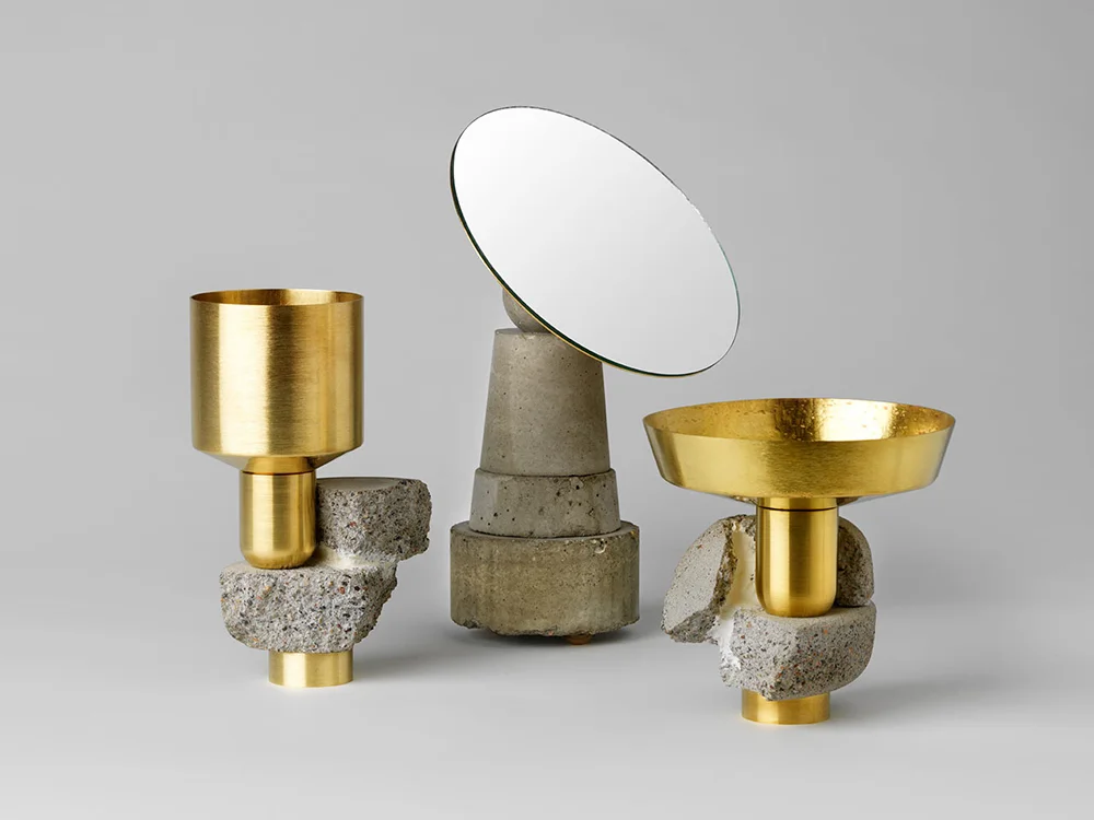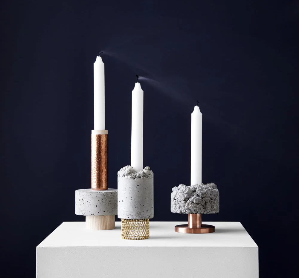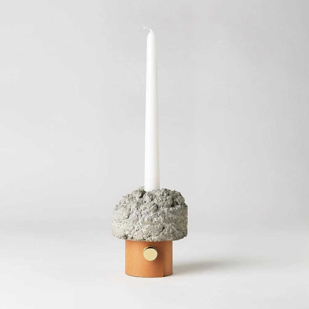 Before Taylor’s Slag collection, there was ‘Crowd’. A uniquely stacked juxtaposition of unexpected materials such as polished brass, rough concrete, bakelite, silver and leather. The playful collection is comprised of 30 unique interchangeable pieces. Components are designed to be continually replaced with new ones, to celebrate a process of continual rejuvenation and reinvention. Taylor employed a full material pallet in this project allowing each candlestick to have it’s own integrity.